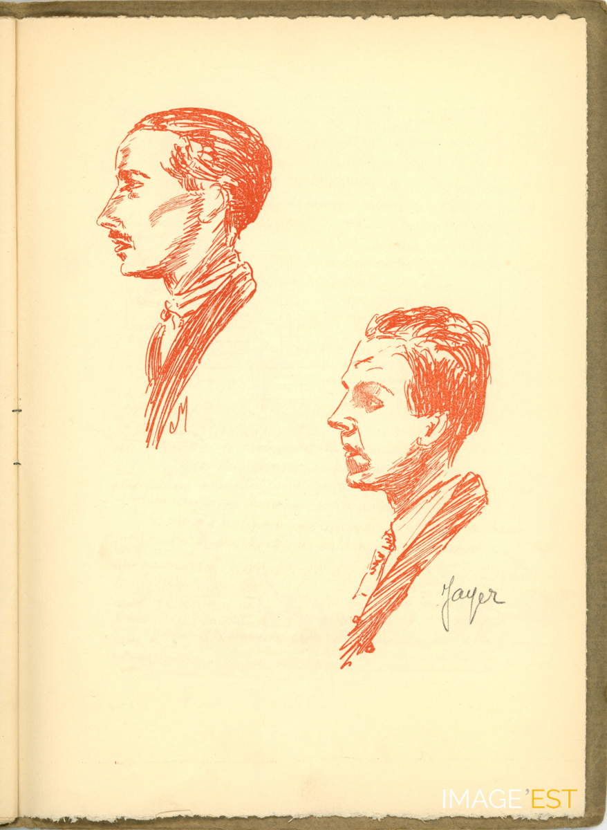 Page extraite d'une brochure intitulée " Guyotinés en Rouge-Turc " comprenant une série de dessins illustrant des professeurs de l'Institut chimique de Nancy. Le dessin est signé " M ".