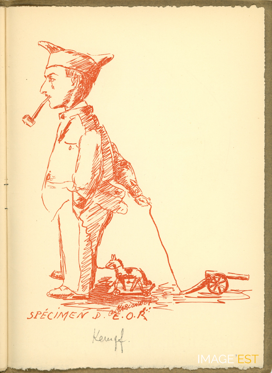 Page extraite d'une brochure intitulée " Guyotinés en Rouge-Turc " comprenant une série de dessins illustrant des professeurs de l'Institut chimique de Nancy. Le dessin est signé " Marconnet ".