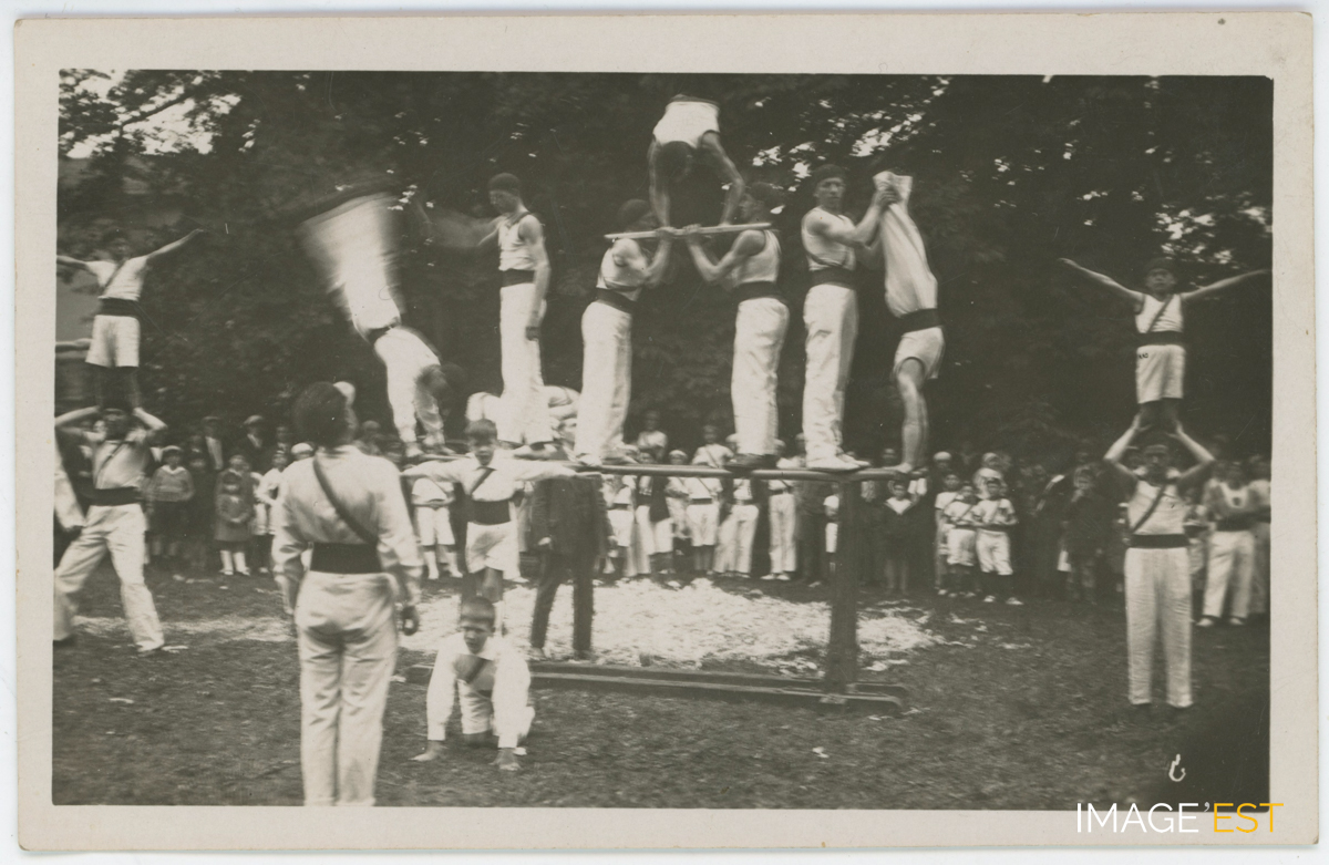 Démonstration de gymnastique par des membres de l' U.S.M. (Union Sportive de Maxéville), au parc de la mairie à Maxéville (Meurthe-et-Moselle).