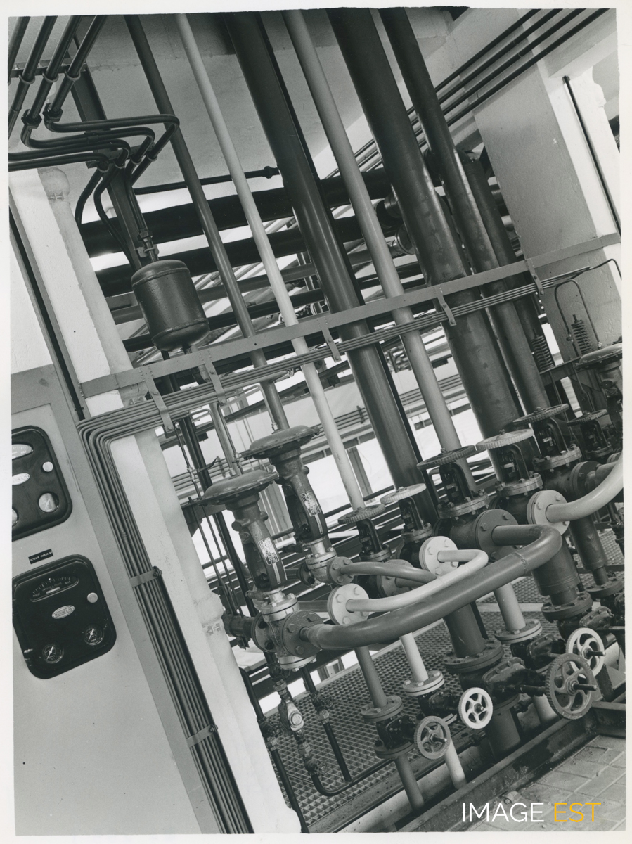 Hall du Génie chimique de l'École nationale supérieure des industries chimiques (ENSIC) à Nancy (Meurthe-et-Moselle). Cachet du photographe " Charles André Nancy n° 4 2951 ". Une mention manuscrite au verso précise " ENSIC. Bâtiment Déglin - Hall du Génie chimique. Canalisation de distribution des fluides ".