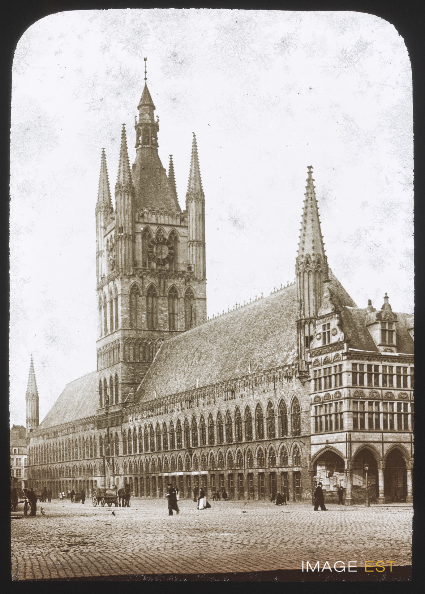 La Halle aux draps à Ypres. Une mention manuscrite en marge de la plaque de verre indique : " Ypres. La Halle aux draps. Ensemble. "