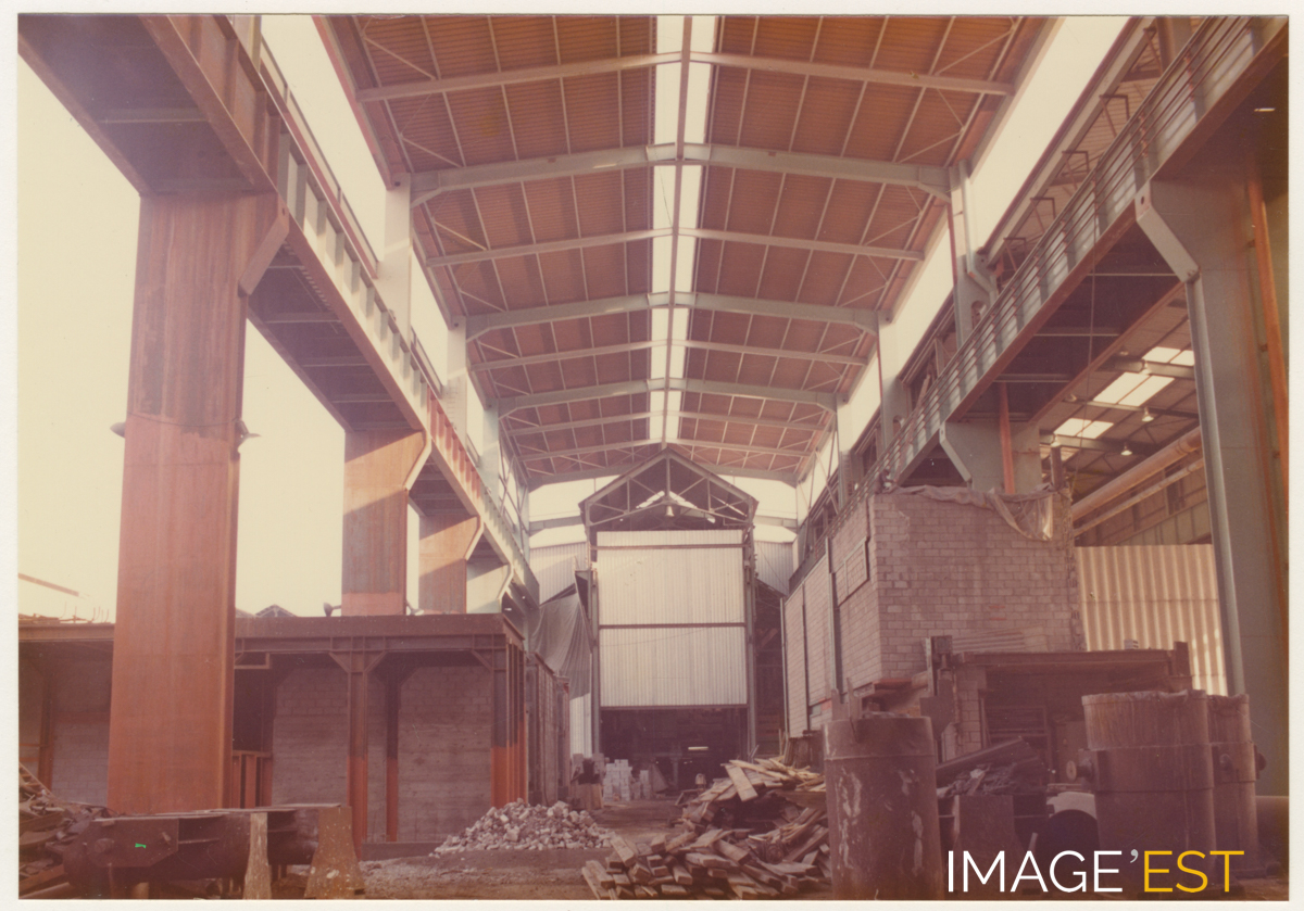 Halle de stockage de matériaux de l'usine de Pont-à-Mousson (Meurthe et Moselle) le 2 février 1974.