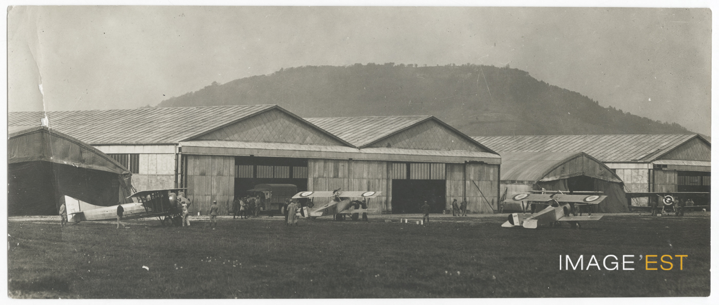 Vue extérieure d'un hangar à avions durant la Première Guerre mondiale. On aperçoit plusieurs avions militaires, un camion et une vingtaine de militaires. Une mention manuscrite au dos précise : " Avions de la guerre 1914/1918. Nieuport Rotatif 110 HP Clerget. Caudron G6 (2 Rotatifs 110 HP Rhône) ".