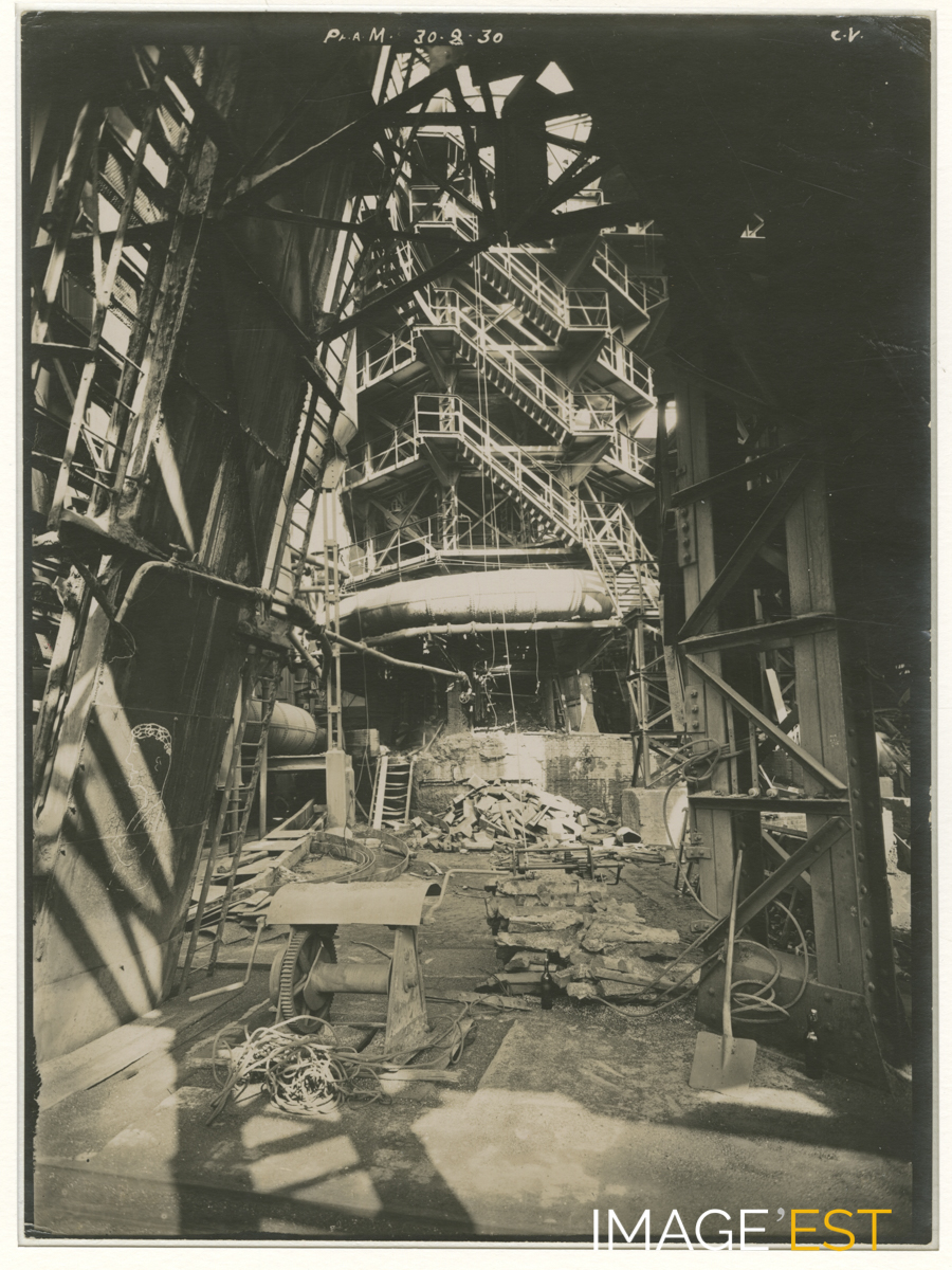 Haut fourneau de la " Société des hauts-fourneaux et fonderies de Pont-à-Mousson " à Pont-à-Mousson (Meurthe et Moselle) photographié le 30 août 1930. En marge de la photographie en haut figurent les mentions : " Pt. A. M. 30.8.30 - C. V. ". Il s'agit du photographe Charles Vagné.