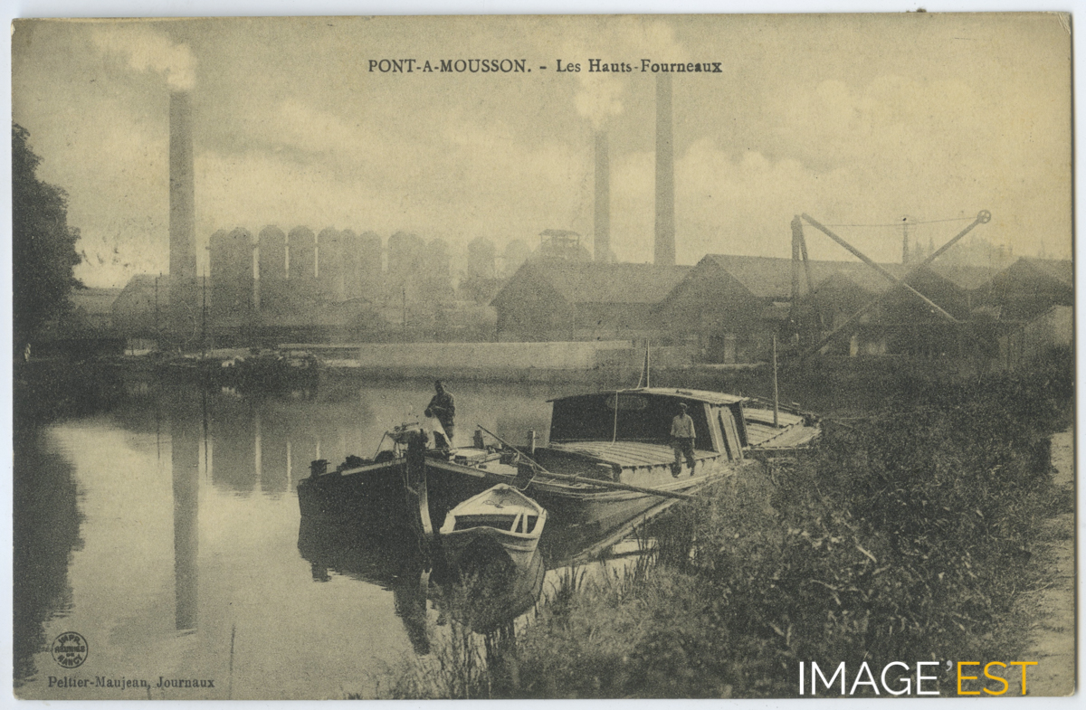 Péniche près des hauts fourneaux de l'usine de Pont-à-Mousson (Meurthe et Moselle).