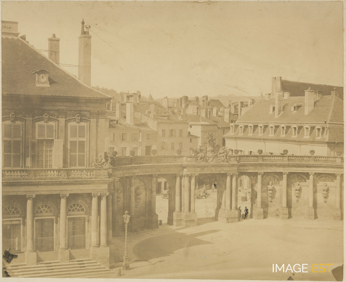 Hémicycle de la place de la Carrière à Nancy (Meurthe-et-Moselle). À gauche l'hôtel Héré, à droite le Palais ducal et à l'arrière-plan, deux immeubles qui seront démolis pour la création de la place Saint-Epvre en 1883. Sous une arche deux soldats en faction et à l'arrière de l'arche principale, deux charrettes s'engagent Grande Rue. Cette photographie pourrait être attribuée au photographe professionnel Félix Roy (1862-1930), membre du Photo-Club nancéien et de la Société lorraine de photographie dès 1896, actif de 1897 à 1920 environ.
