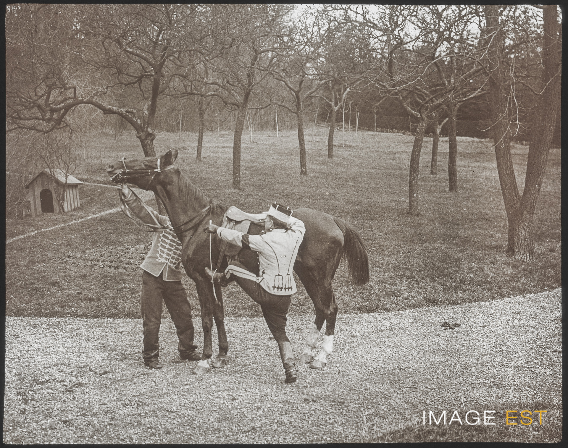 Henri d'Hamonville montant à cheval dans la propriété de Val-au-Mont à Malzéville (Meurthe-et-Moselle). Une mention manuscrite en marge de la plaque de verre indique : " Henri d'Hamonville. "