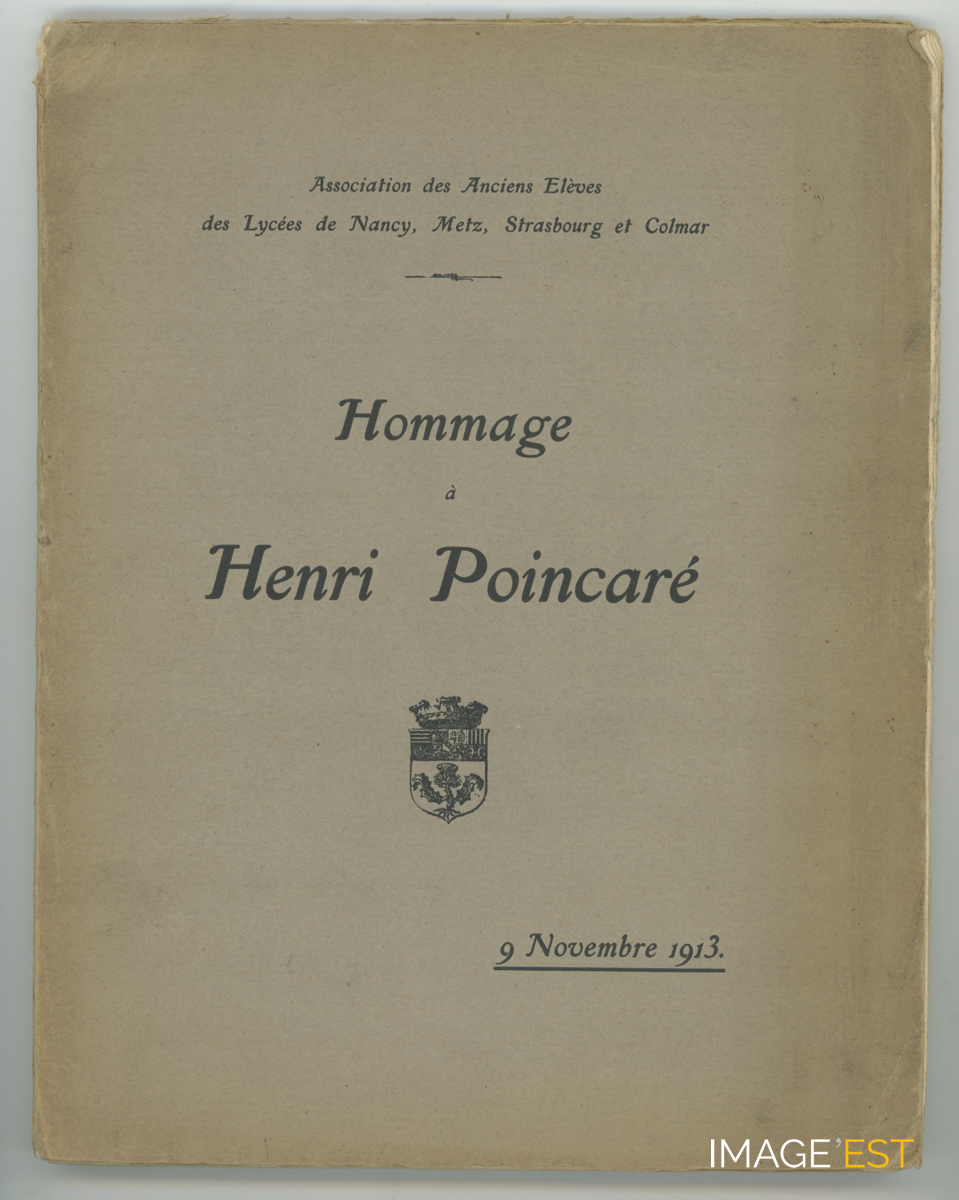 Brochure intitulée " Hommage à Henri Poincaré. 9 novembre 1913 " illustrée d'une représentation du buste scuplté par E.- Jh Carlier. C'est par décret du président de la République française en 1913 que le " Lycée de garçons de Nancy " prendra le nom de " Lycée Henri Poincaré ". Une plaque commémorative sera apposée sur la façade de la maison au n°2, rue de Guise où est né Henri Poincaré et un buste sera érigé dans le jardin du Lycée de Nancy, à la mémoire de ce savant. On trouvera plusieurs planche hors-texte (maison natale à l'angle de la Grande rue et de la rue de Guise ; portrait du savant en 1908 et en 1872).