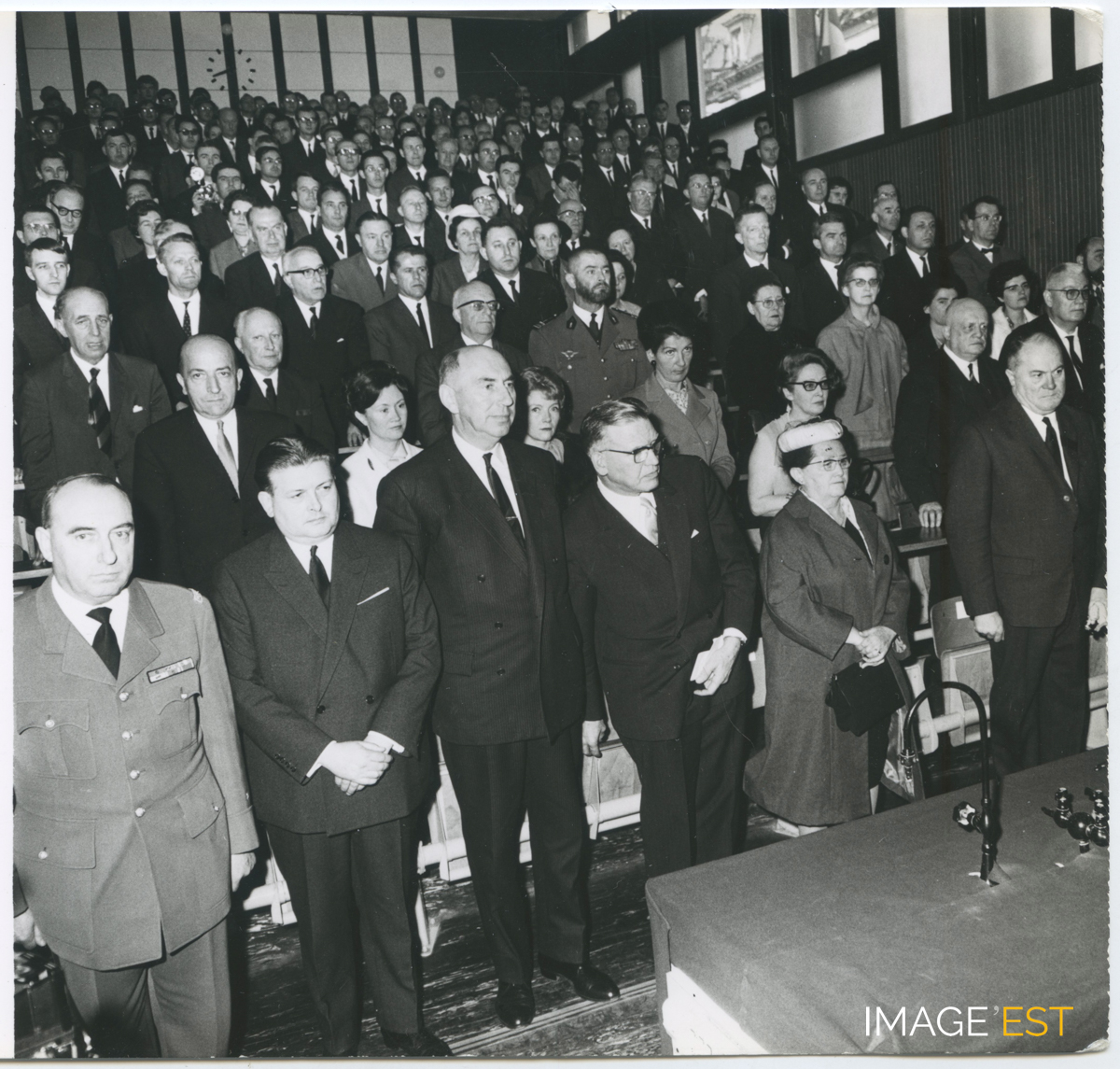 Personnalités réunies pour un hommage à Pierre Donzelot (1901-1960) à l'occasion de l'inauguration du nouvel amphithéâtre Pierre Donzelot de l'École nationale supérieure des industries chimiques, rue Déglin à Nancy (Meurthe-et-Moselle).