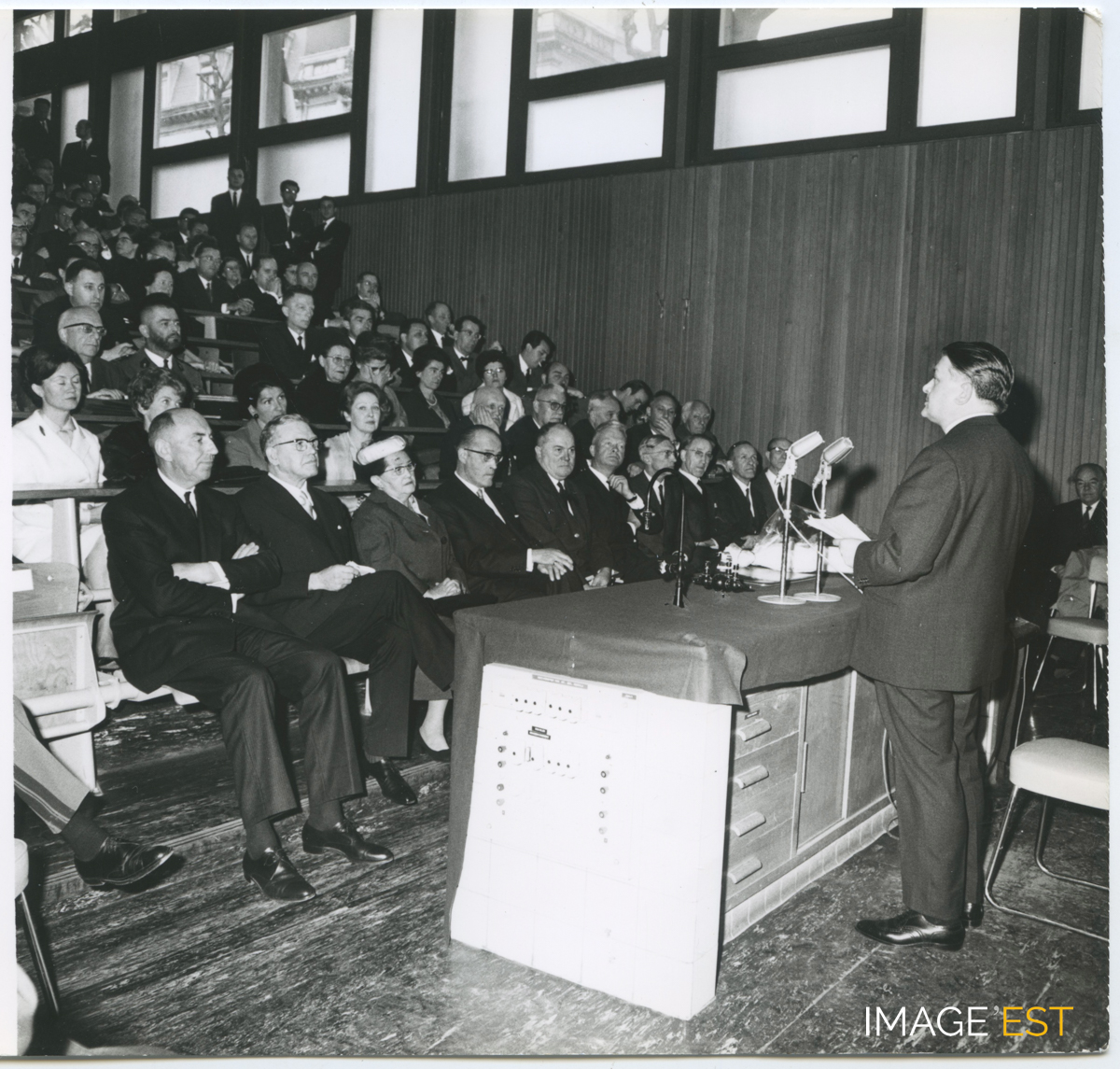 Personnalités réunies pour un hommage à Pierre Donzelot (1901-1960) à l'occasion de l'inauguration du nouvel amphithéâtre Pierre Donzelot de l'École nationale supérieure des industries chimiques, rue Déglin à Nancy (Meurthe-et-Moselle).
