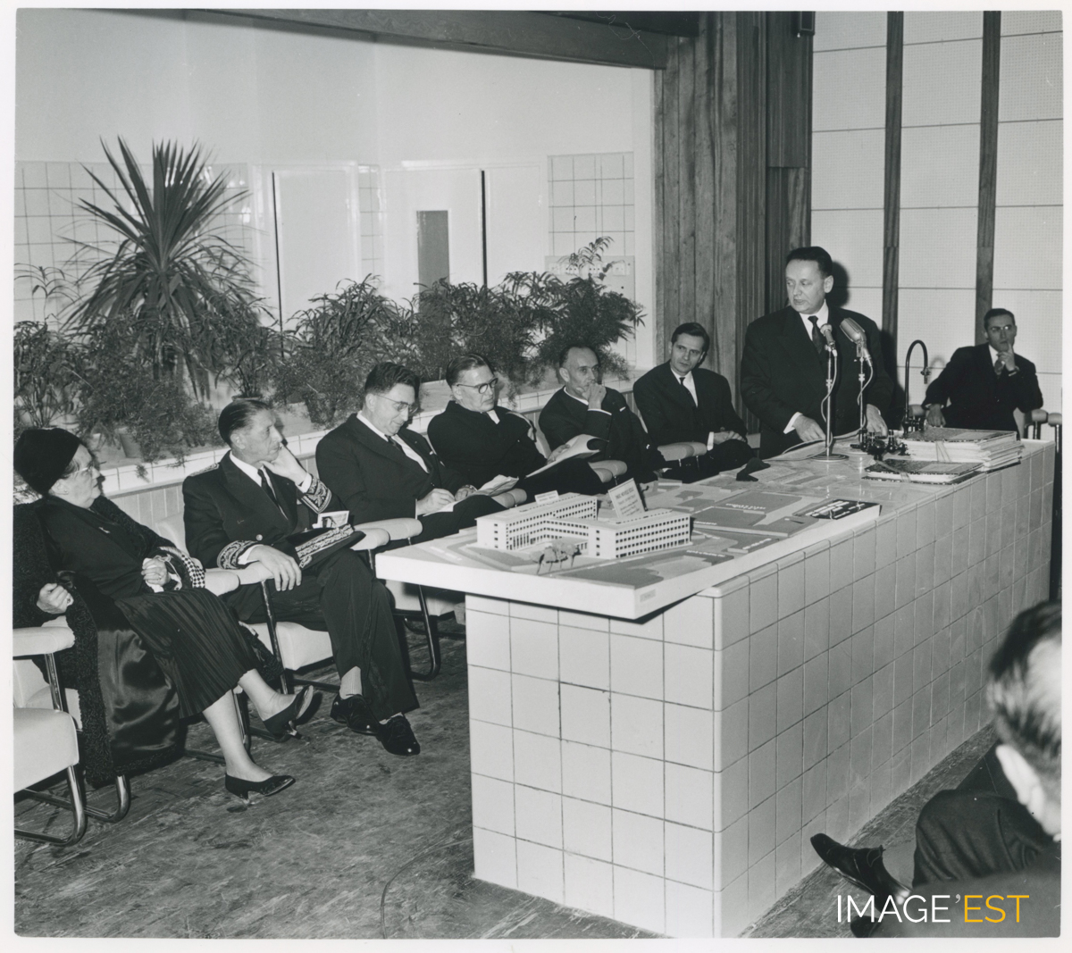 Discours à l'occasion d'un hommage à Pierre Donzelot (1901-1960) lors de l'inauguration du nouvel amphithéâtre Pierre Donzelot de l'École nationale supérieure des industries chimiques, rue Déglin à Nancy (Meurthe-et-Moselle). Cachet du photographe Charles André (N°7-1167) au verso.