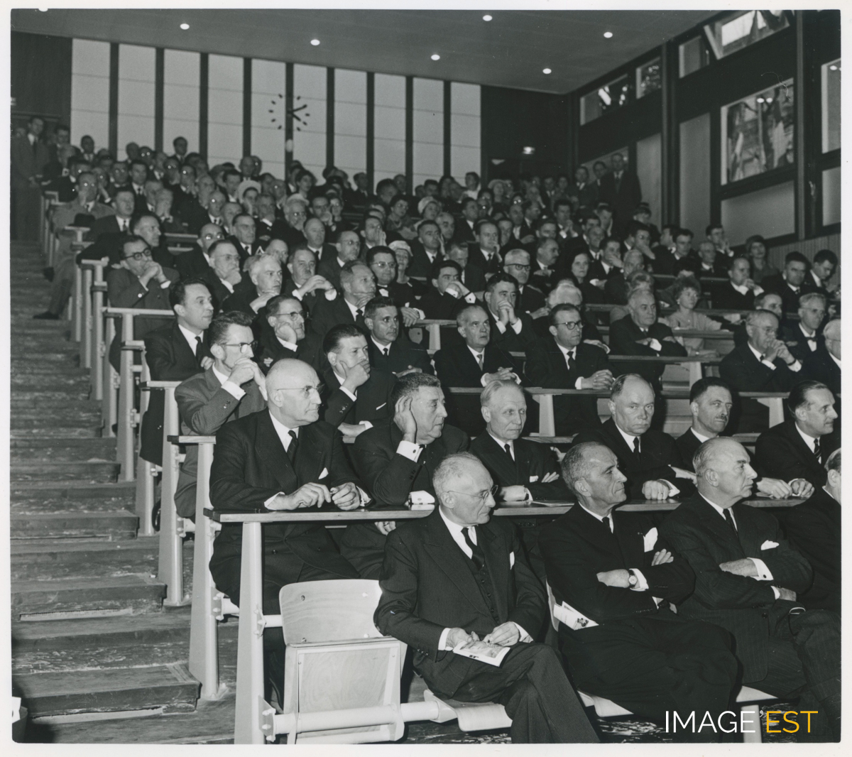 Personnalités réunies pour un hommage à Pierre Donzelot (1901-1960) à l'occasion de l'inauguration du nouvel amphithéâtre Pierre Donzelot de l'École nationale supérieure des industries chimiques, rue Déglin à Nancy (Meurthe-et-Moselle). Cachet du photographe Charles André (N°5-1167) au verso.