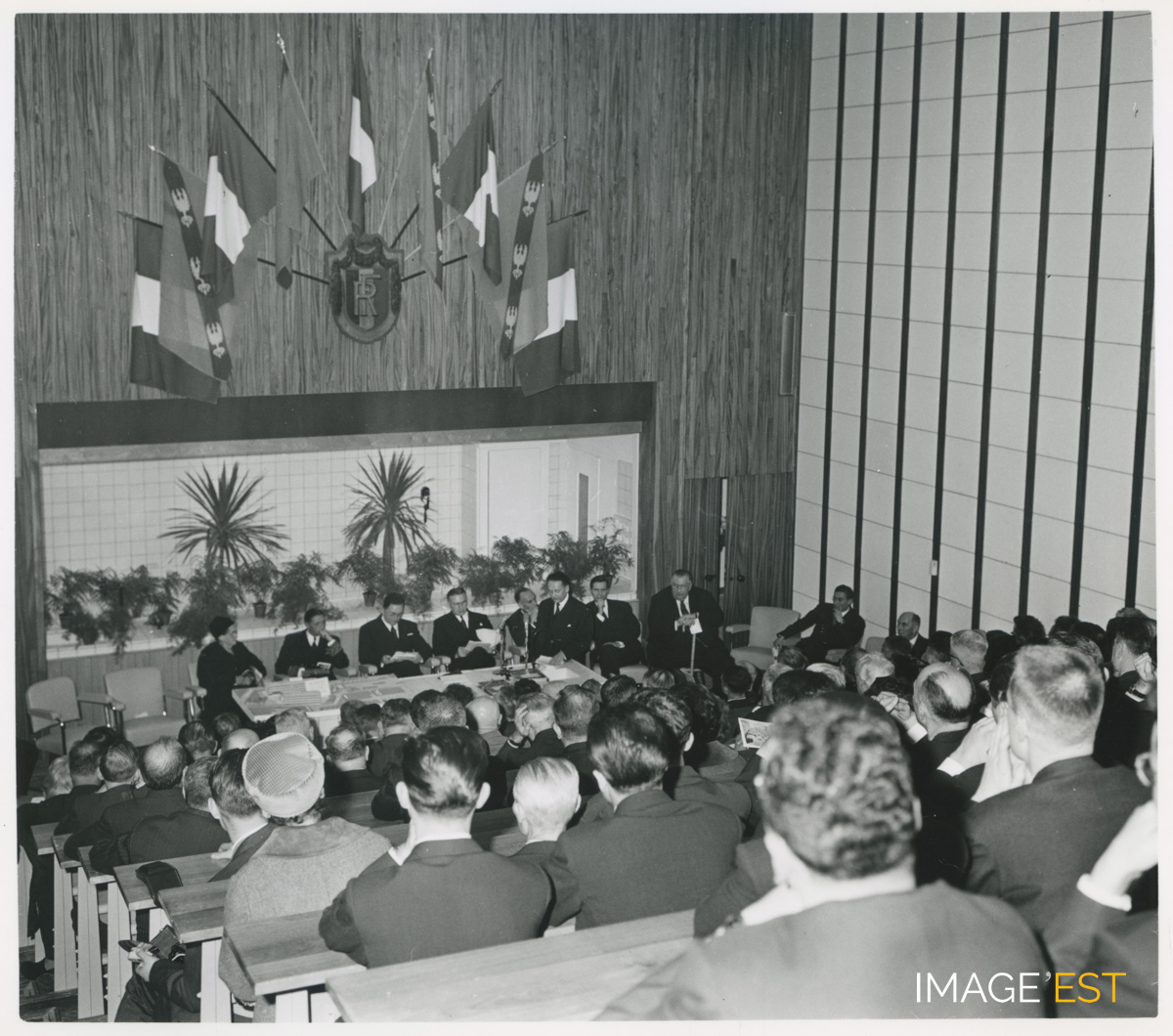 Personnalités réunies pour un hommage à Pierre Donzelot (1901-1960) à l'occasion de l'inauguration du nouvel amphithéâtre Pierre Donzelot de l'École nationale supérieure des industries chimiques, rue Déglin à Nancy (Meurthe-et-Moselle). Cachet du photographe Charles André (N°8-1167) au verso.