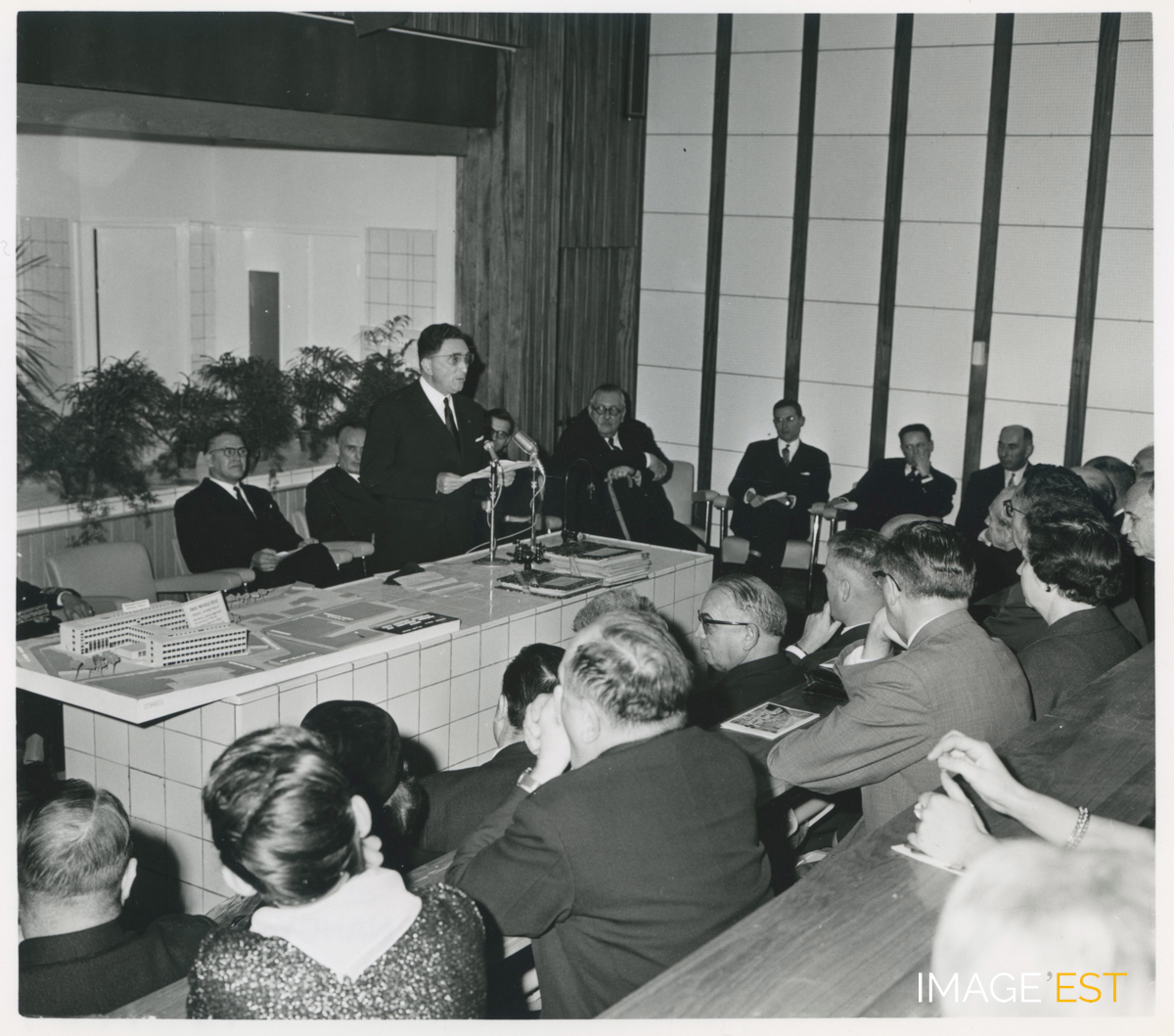 Discours à l'occasion d'un hommage à Pierre Donzelot (1901-1960) lors de l'inauguration du nouvel amphithéâtre Pierre Donzelot de l'École nationale supérieure des industries chimiques, rue Déglin à Nancy (Meurthe-et-Moselle). Cachet du photographe Charles André (N°16-1167) au verso.
