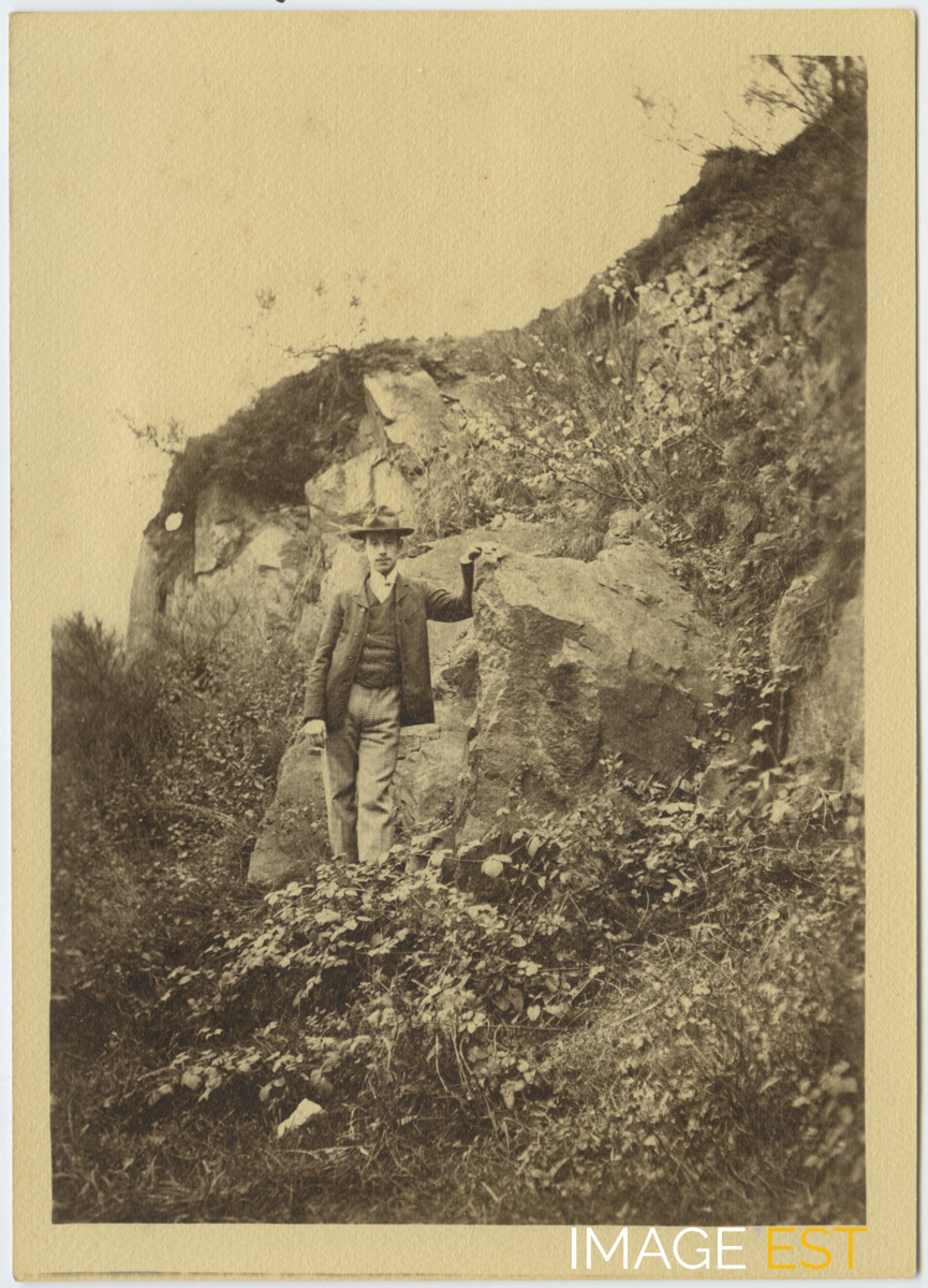 Homme près d'un rocher probablement dans le département des Vosges. Cette photographie est extraite d'un album en cuir repoussé comprenant un ensemble de 48 photographies (format 13 x 18 cm), noir et blanc, illustrant les loisirs et la vie d'une famille aisée probablement dans le département des Vosges à la fin du XIXe ou au début du XXe siècle.