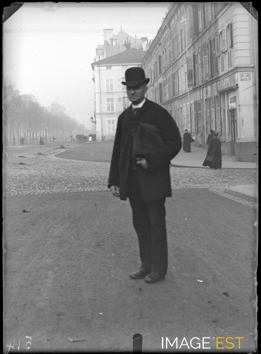 Homme tenant un sac sous son bras, sur le cours Léopold près de la rue de la Monnaie à Nancy (Meurthe-et-Moselle).
