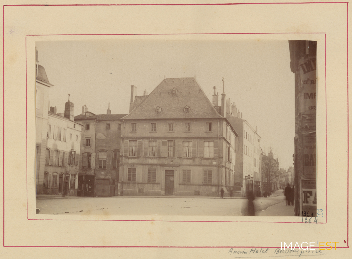 Hôtel Bassompierre, place des Dames (actuelle place du colonel Fabien) à Nancy (Meuthe-et-Moselle). En marge de la photographie figure l'annotation au crayon : " Ancien hôtel Bassompierre ", le numéro " 1364 " et un monogramme représentant deux " R " (dont un en miroir ) surmontés d'une couronne. Cette photographie pourrait être attribuée au photographe professionnel Félix Roy (1862-1930), membre du Photo-Club nancéien et de la Société lorraine de photographie dès 1896, actif de 1897 à 1920 environ.