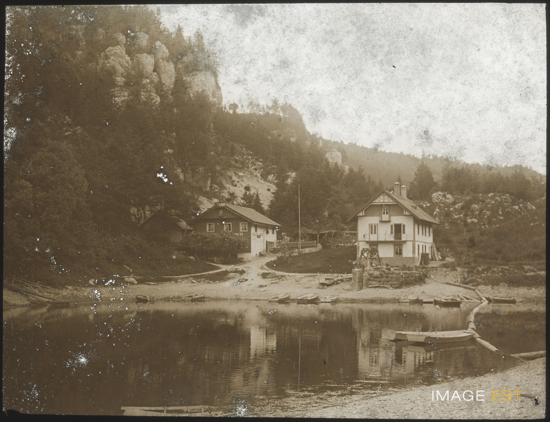 Hôtel du Saut du Doubs au bord du Doubs à Les Brenets (Suisse). Une mention manuscrite en marge de la plaque de verre indique : " Les Brenets. À la perte du Doubs. "