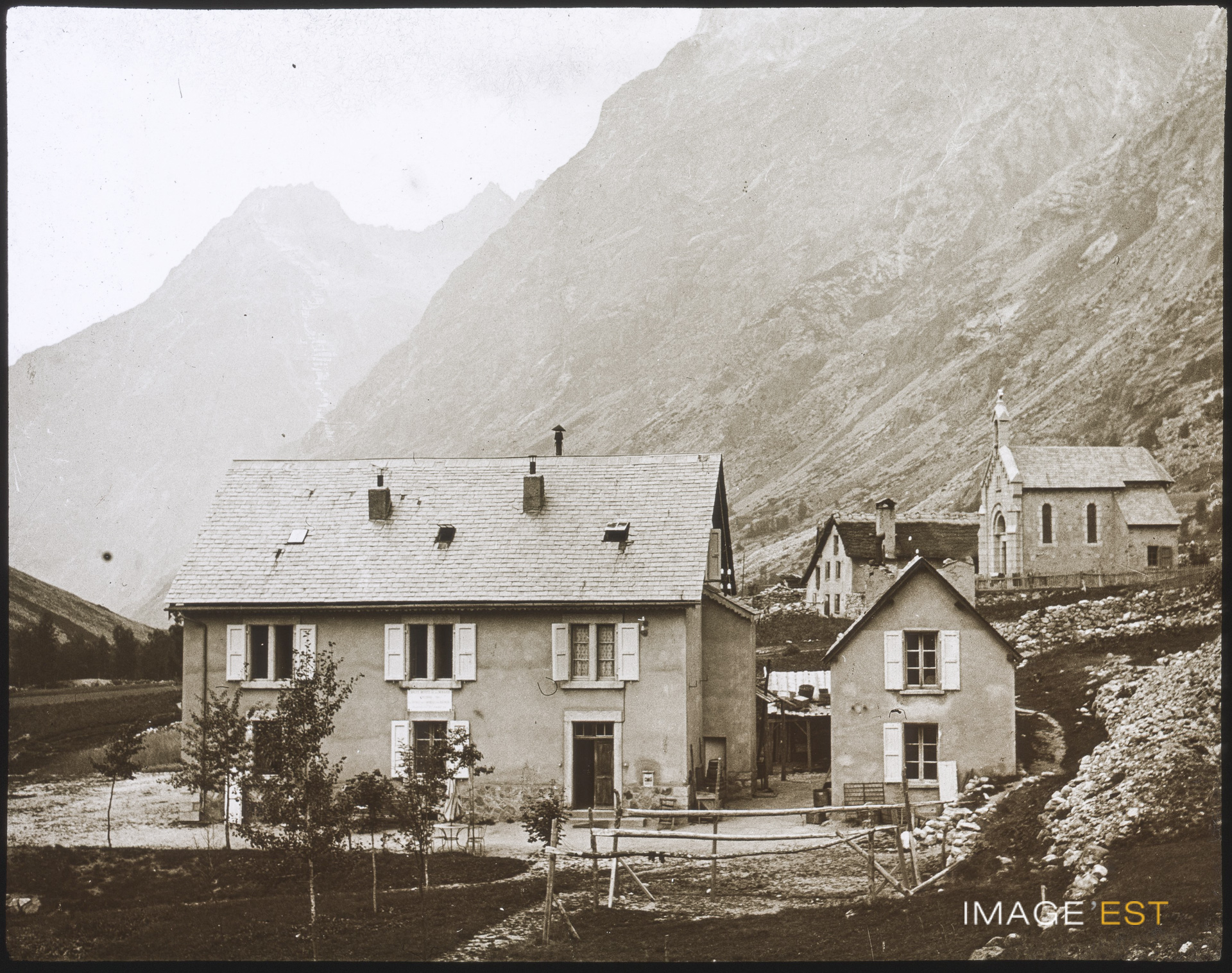 Hôtel à La Bérarde (Isère). Une mention manuscrite en marge de la plaque de verre indique : " Chalet, Hôtel et chapelle de la Bérarde. "