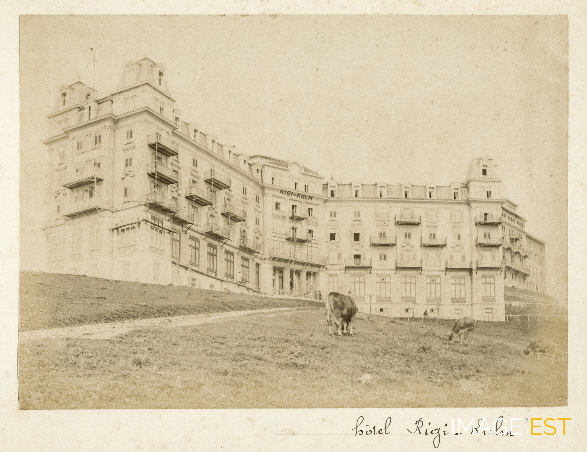 Hôtel Rigi-Kulm sur les bords du lac des Quatre-Cantons près de Lucerne (Suisse). Cette photographie est extraite d'un album intitulé " Suisse J. D. 1890 " comprenant 71 photographies contrecollées sur carton, prises par le lieutenant-colonel Joseph Jules Delarue (1839-1925), commandant le 50e régiment territorial d'infanterie de Nancy, photographe amateur et membre actif de la prestigieuse Société Lorraine de Photographie (fondée à Nancy en 1894) à laquelle il adhère en 1895 (Bulletin de la Société Lorraine de Photographie, n°3 septembre 1895).