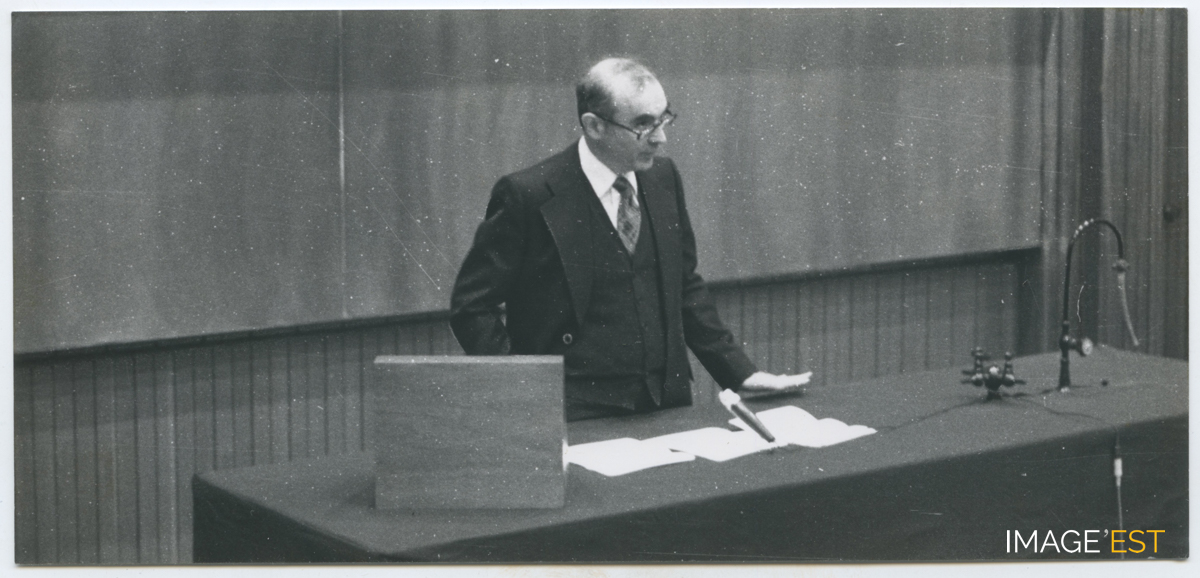 Portrait de Hubert Curien (1924-2005), né à Cornimont (Vosges). Chercheur, universitaire, agrégé de physique, docteur ès sciences (1952), Ministre de la recherche et de la technologie (1984-1986 et 1988-1993), président de l'Académie des Sciences. Avec ses collègues de l'université Henri Poincaré à Nancy il crée des « Journées de la culture scientifique et technique ».