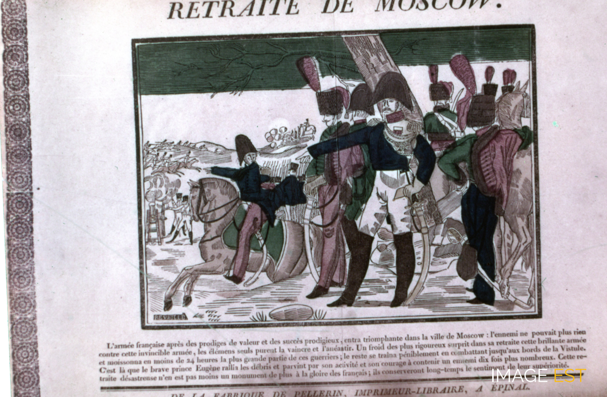 Image d'Épinal représentant la retraite Moscou en 1816, éditée par Jean-Charles Pellerin (1756-1836) à Épinal (Vosges) faisant partie des collections du Musée lorrain (Art et traditions populaires de Lorraine). En marge de la diapositive figure la mention : " 5 - " Retraite de Moscou Imagerie Pellerin, Épinal, Restauration.". Séries de diapositives sélectionnées et commentées par Jean Hurstel, directeur du Service éducatif des Musées de l'Académie de Nancy-Metz.