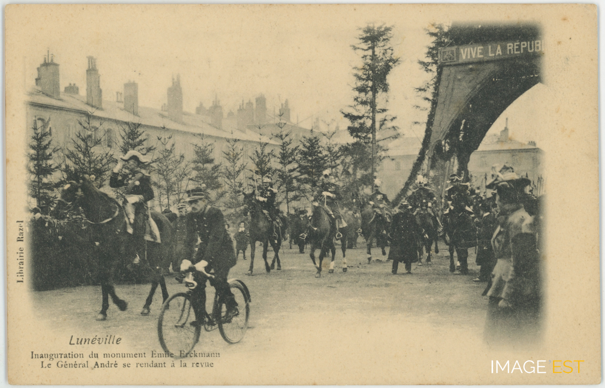 Le général André se rendant à la revue lors de l'inauguration du monument Émile Erckmann à Lunéville (Meurthe-et-Moselle).