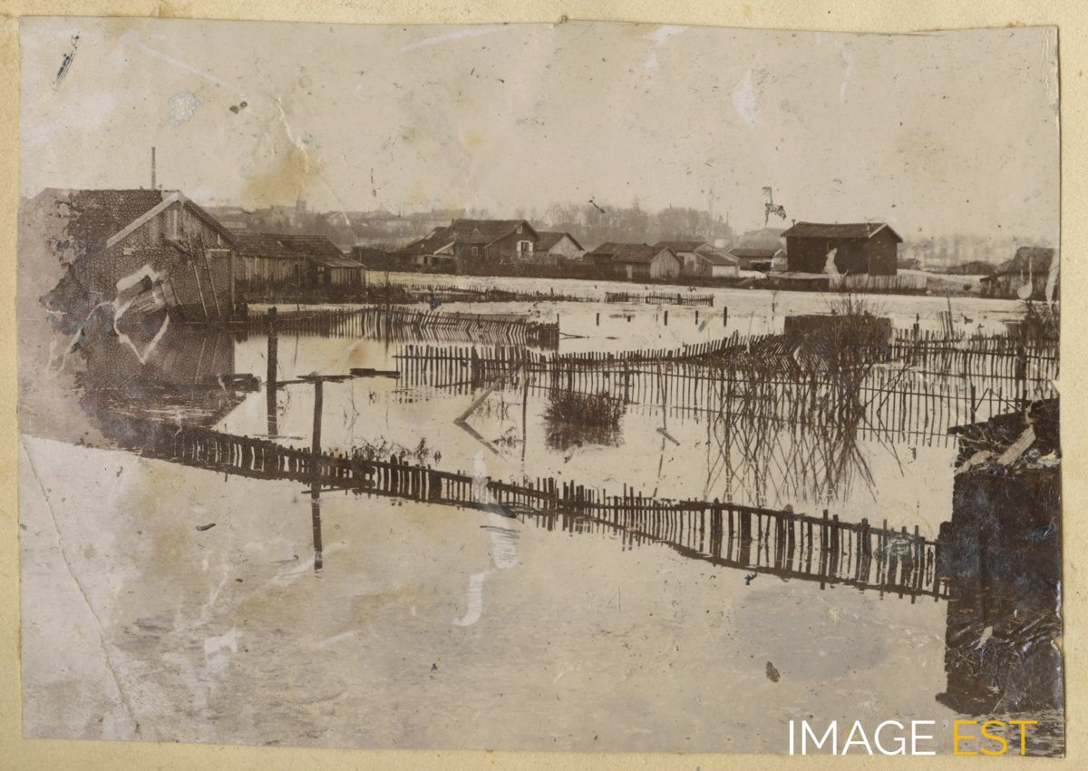 Inondations de 1910 à Tomblaine (Meurthe-et-Moselle). Une mention manuscrite en marge du document précise : " Inondations dans la prairie de Tomblaine ".