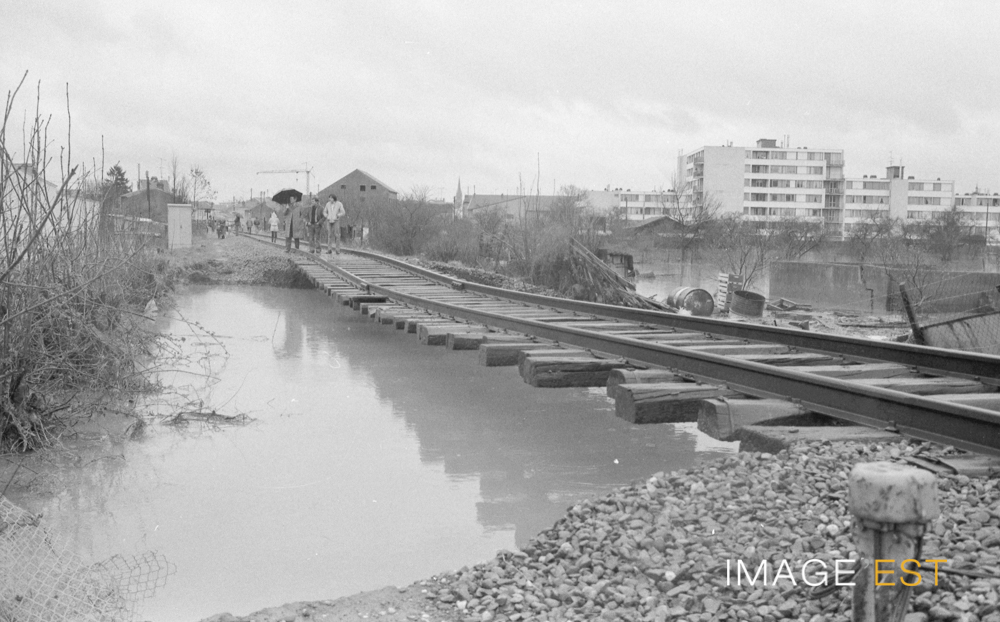 Inondations de 1983 à Maxéville (Meurthe-et-Moselle). Les crues ont miraculeusement préservé la voie ferrée encore maintenue par les traverses de bois.