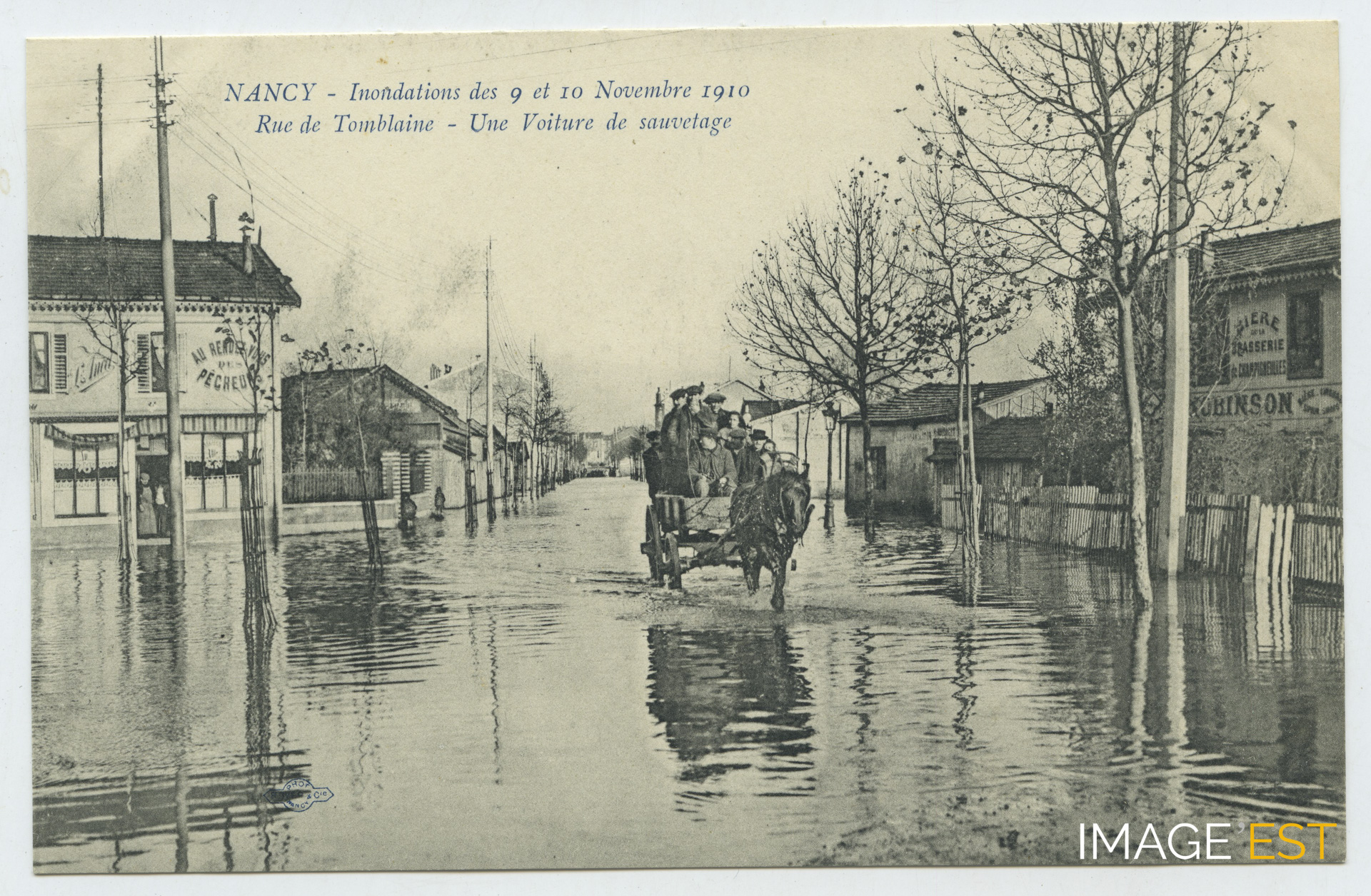 Une voiture de sauvetage rue Tomblaine à Nancy (Meurthe-et-Moselle) lors des inondations des 9 et 10 novembre 1910.