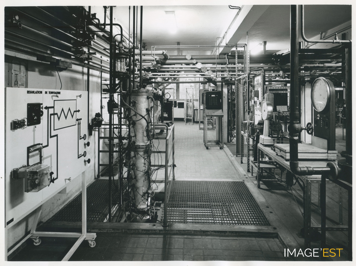 Installations techniques de l'École nationale supérieure des industries chimiques (ENSIC) à Nancy (Meurthe-et-Moselle). Cachet du photographe " Charles André Nancy n° 83-4107 ". Une mention manuscrite au verso précise " Bâtiment Déglin - Génie chimique ".