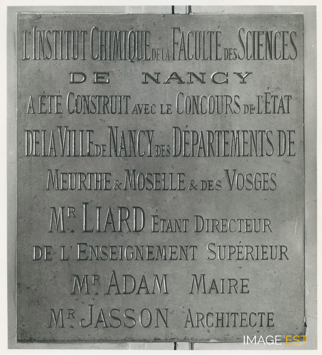 Plaque commémorative de l'Institut chimique à Nancy (Meurthe-et-Moselle). Le texte complet précise : " l'Institut chimique de la Faculté des Sciences de Nancy a été construit avec le concours de l'État, de la Ville de Nancy, des départements de Meurthe & Mosele & des Vosges. Mr Liard, étant directeur de l'Enseignement supérieur. Mr Adam, maire. Mr Jasson, architecte ". Cachet du photographe nancéien " Charles André n° 47 35 35 ".