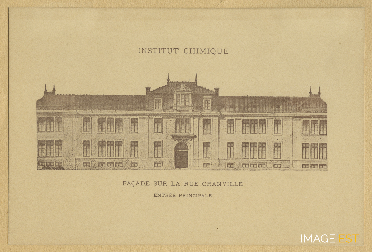 Façade de l'entrée principale de l'Institut chimique rue Grandville à Nancy (Meurthe-et-Moselle).