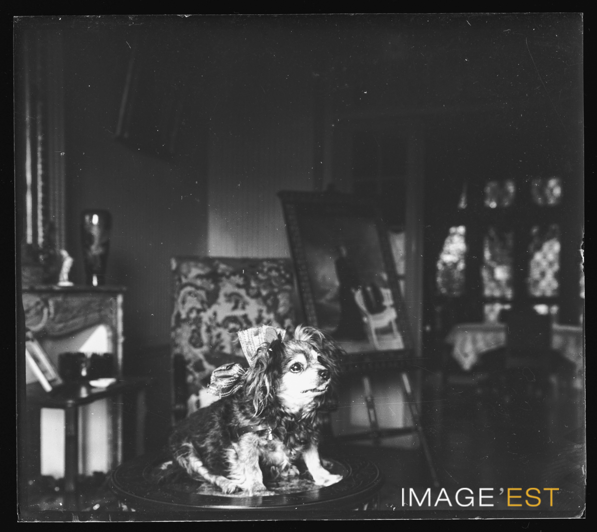 Chien photographié sur un guéridon à l'intérieur d'une maison non identifiée.