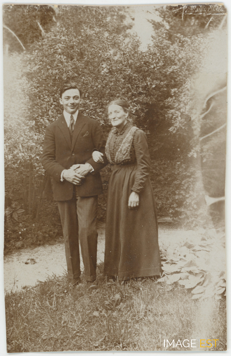 Jean Moreau et sa grand-mère, Marie Sonrier, épouse d'Alexis Hoffman, mère d'Alice Moreau à Poussay (Vosges). (Source : Archives privées des familles Kalis-Moreau).