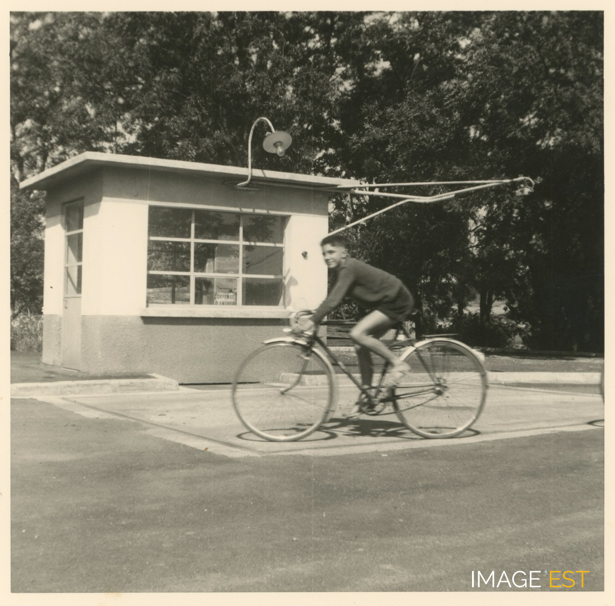 Jeune cycliste passant devant la bascule (système de pesage des camions) sur la carreau de la mine Arbed à Maxéville (Meurthe-et-Moselle).