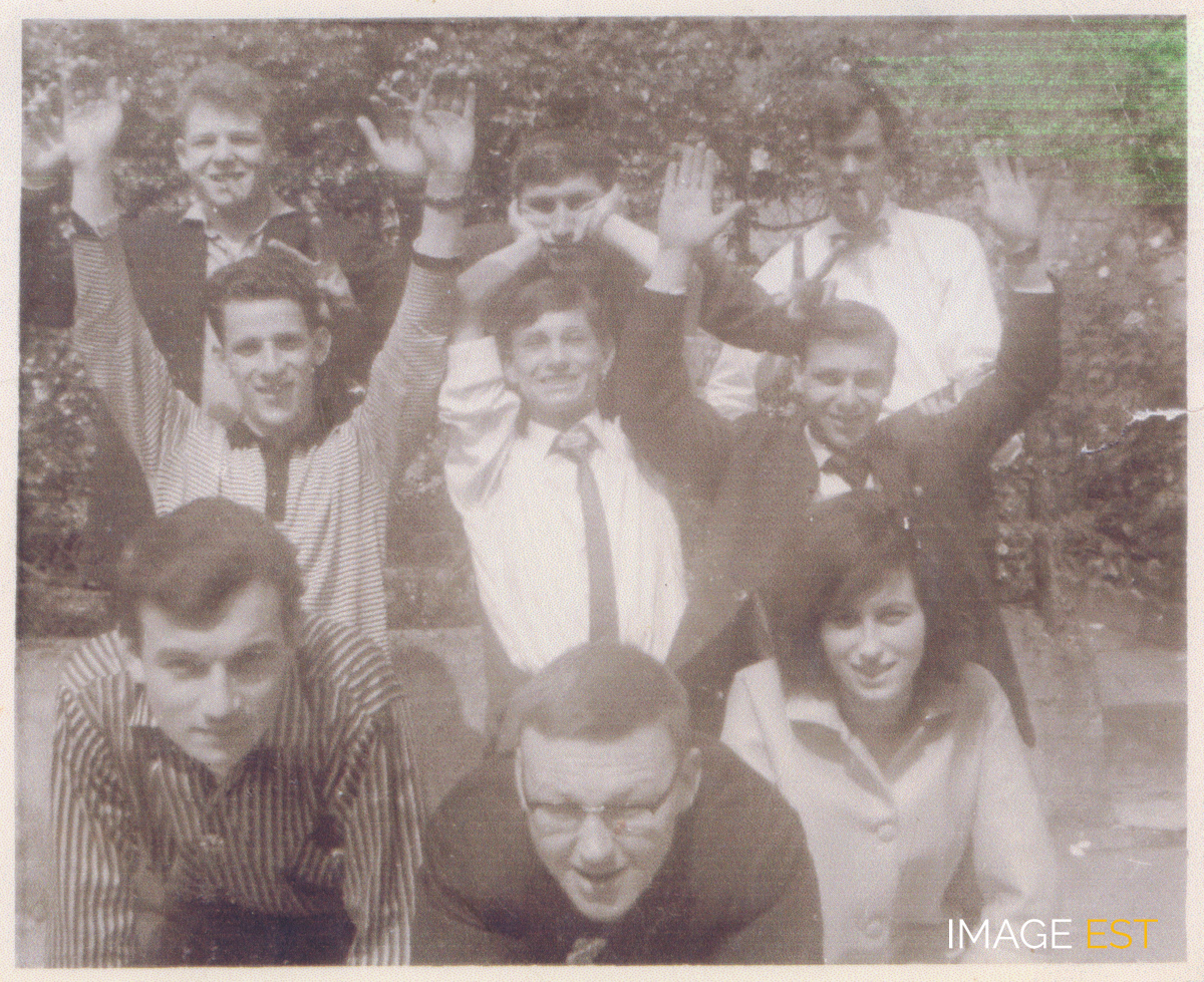 Groupe de jeunes gens à Maxéville (Meurthe-et-Moselle). Au verso, l'annotation : " Conseil de révision 1963 ".