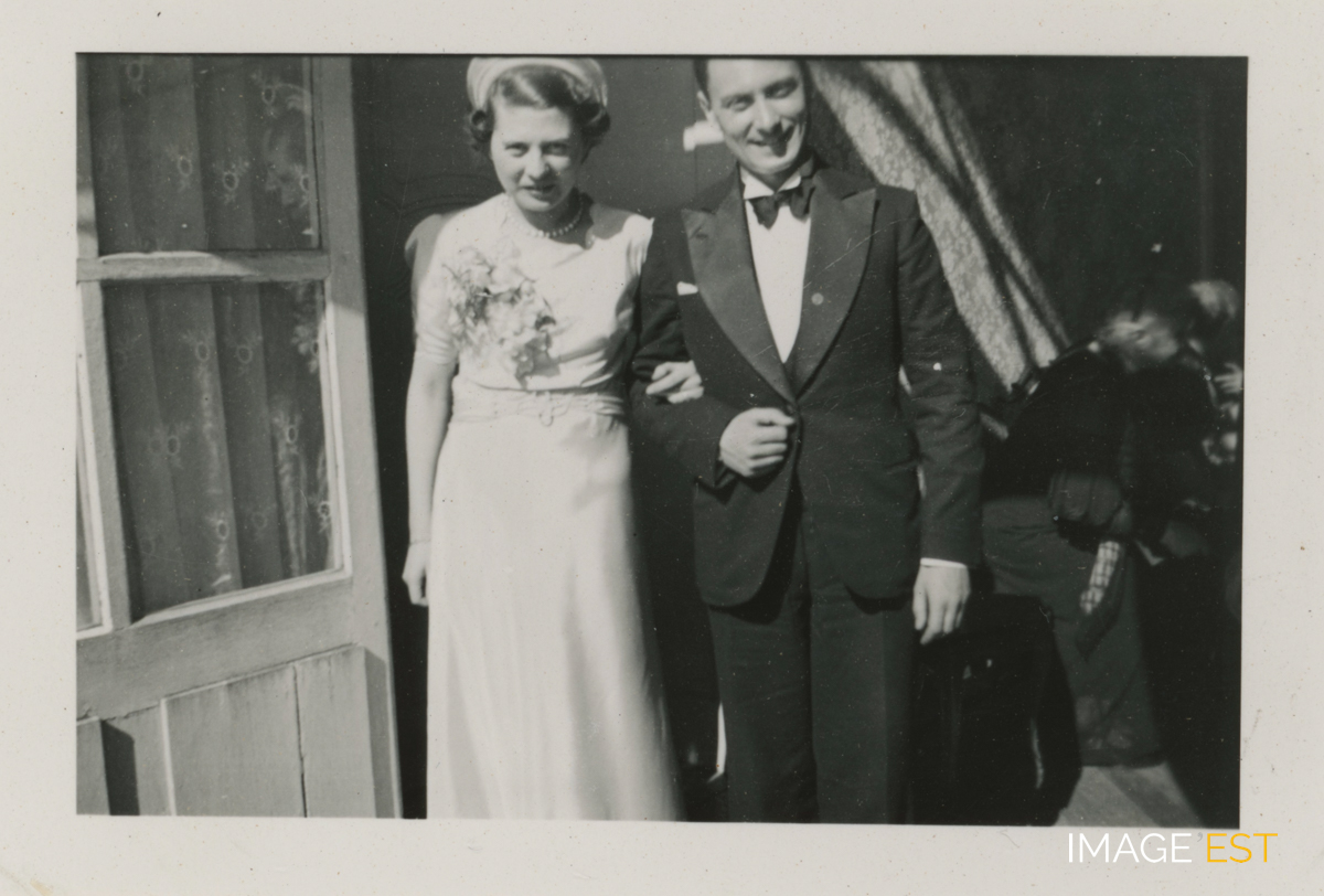 Jeunes mariés à Nancy (Meurthe-et-Moselle) en 1938. Une mention manuscrite au dos indique : " Nancy 1938 ".