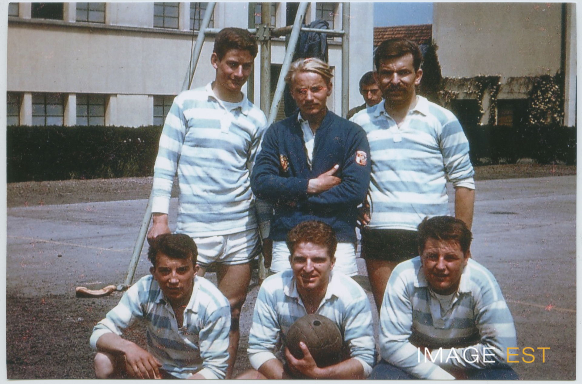 Joueurs de volley-ball de Maxéville devant l'école Buffon du Haut-du-lièvre à Nancy (Meurthe-et-Moselle) en 1961.