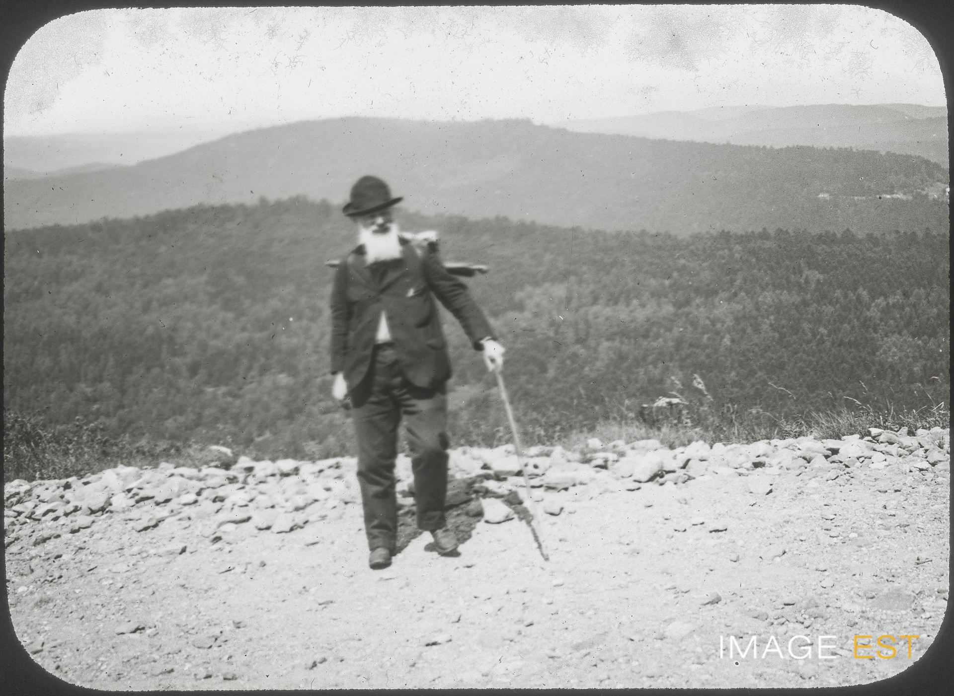 Jules Lejeune, sur un sentier à Dabo (Moselle). Une mention manuscrite en marge de la plaque de verre indique : " Dabo. Mr Jules Lejeune 1896. "