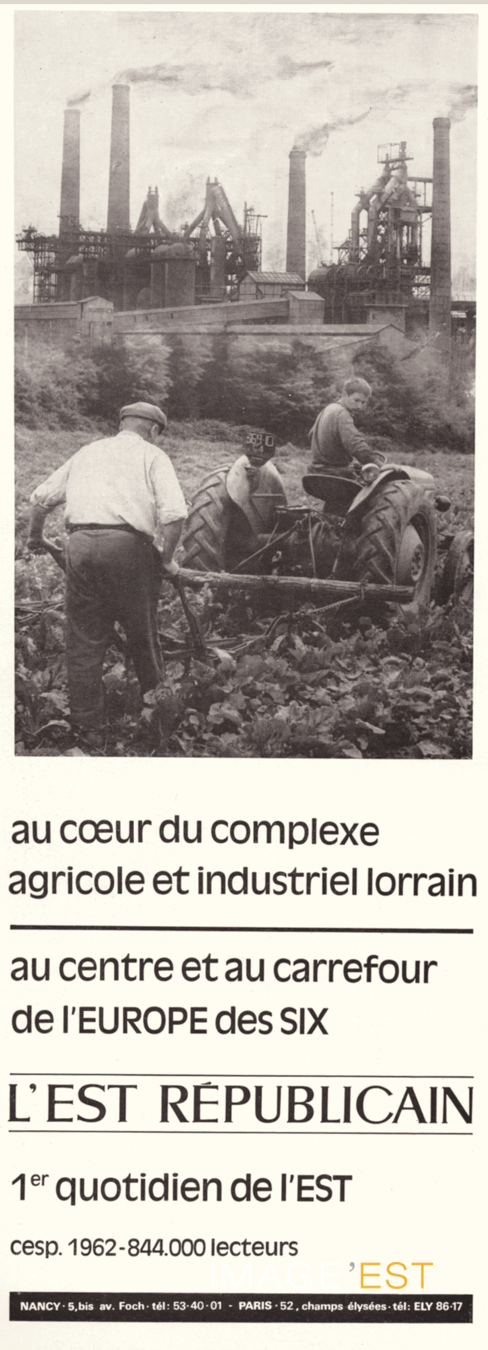 Publicité du journal L'Est républicain, quotidien régional, fondé en 1889 à Nancy (Meurthe-et-Moselle) qui comptait en 1962, 844 000 lecteurs. Cette image publicitaire illustre au début des années soixante la survivance des pratiques rurales face aux développements du monde industriel.