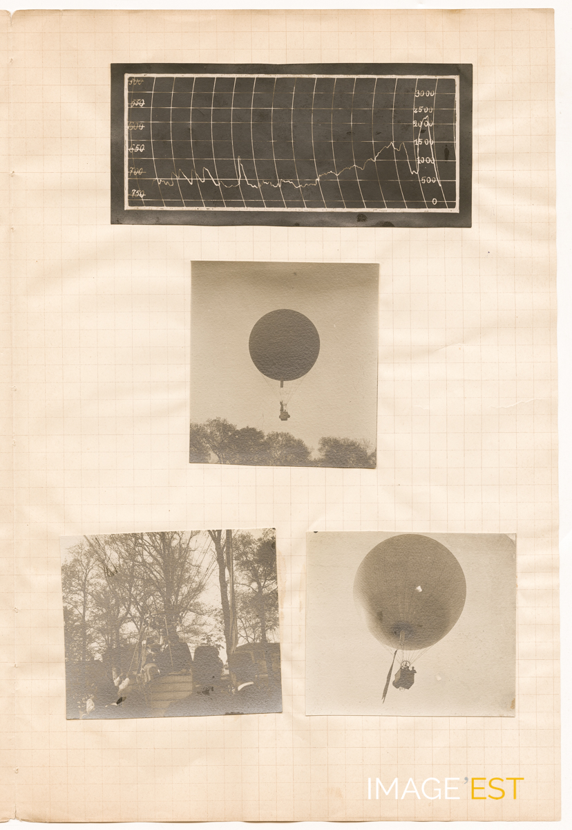 Photographies illustrant les préparatifs d'un départ en ballon dans le cadre de " La fête aéronautique " organisée par la Ligue nationale aérienne de l'Est, l'Aéro-Club de l'Est et l'Automobile-Club lorrain, dans l'enceinte du concours hippique du parc de la Pépinière à Nancy (Meurthe-et-Moselle). Six ballons sont impliqués dans cette course. On distingue un haut un graphique (6,5 x 14,5 cm) d'une ascension et deux clichés (8 x 6,5 et 7 x 8,5 cm) représentant le ballon de Marie Marvingt et Antonin Bergeret. Sur le cliché de gauche (7 x 8,5 cm), probablement Émile Friant, à bord d'une nacelle, tenant un sac de sable entre ses mains.