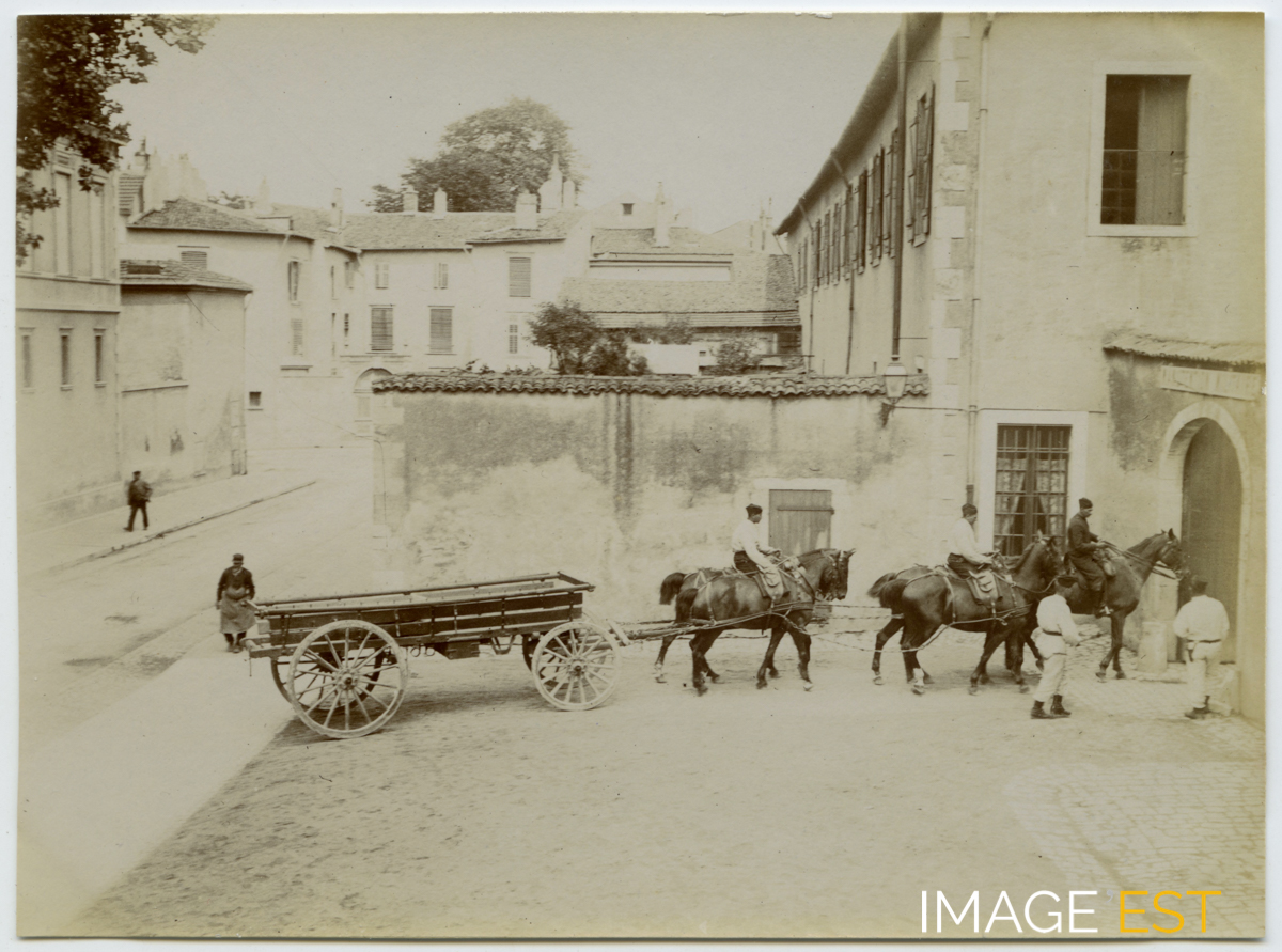 Arrivée d'un attelage de quatre chevaux tirant une cariole, à l'entrée de la Manutention à Nancy (Meurthe-et-Moselle) en 1897.