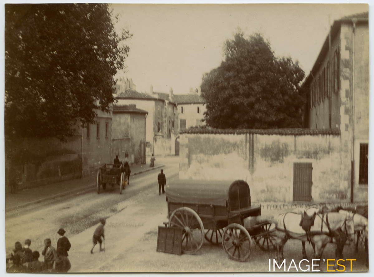 Attelage de chevaux avec cariole et groupe d'enfants, rue de la Manutention et devant l'entrée de la Manutention à Nancy (Meurthe-et-Moselle), le 16 août 1897. Une mention manuscrite au verso de cette photographie précise : " 127 - Rue de la Manutention - Lundi 16 août 1897 ".