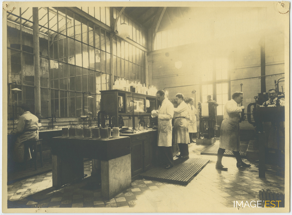 Un laboratoire de l'Institut chimique de Nancy (ICN) à Nancy (Meurthe-et-Moselle). Une mention manuscrite au verso précise : " Laboratoire de teinture et impression - Bâtiment Sellier - R.C. ". Cachet " Scherbeck Nancy " au verso.