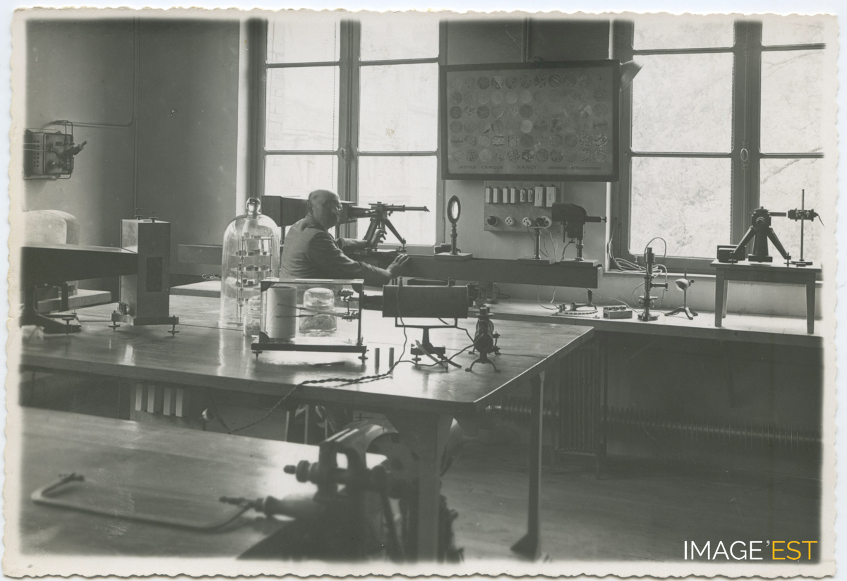 Un laboratoire de l'École nationale supérieure des industries chimiques (ENSIC) à Nancy (Meurthe-et-Moselle). À remarquer l'inscription sur un tableau entre les deux fenêtres : " Institut chimique - Nancy - Laboratoire métallographique ".