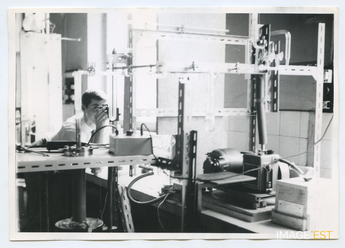 Dans un laboratoire de l'École nationale supérieure des industries chimiques (ENSIC) à Nancy (Meurthe-et-Moselle). Une mention manuscrite au verso précise : " Labo Balesdent. Mesure de tension de vapeur métallique ".