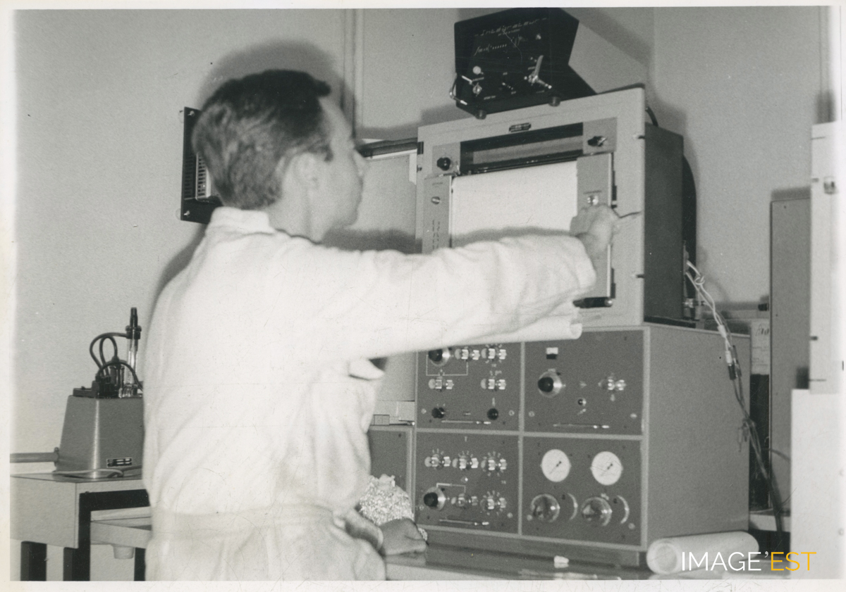 Dans un laboratoire de l'École nationale supérieure des industries chimiques (ENSIC) à Nancy (Meurthe-et-Moselle). Une mention manuscrite au verso précise : " Labo Niclause. Chromatographe ".