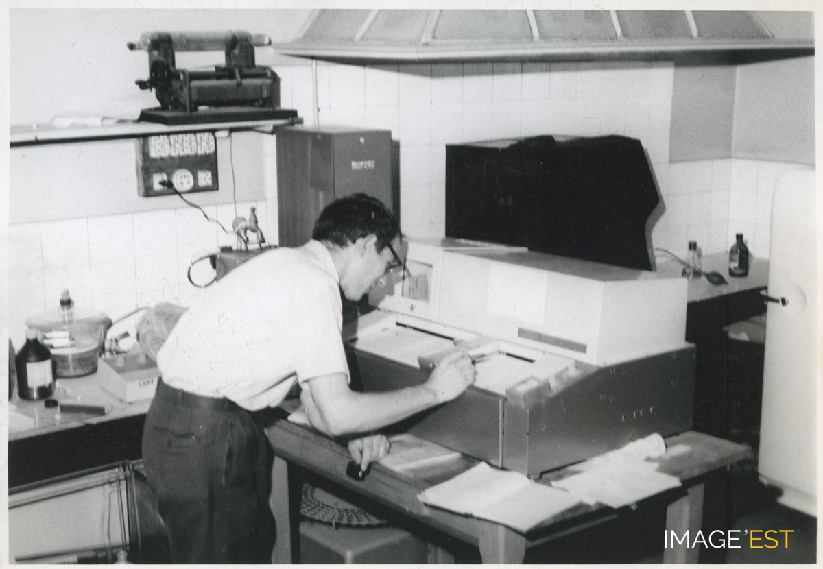 Dans un laboratoire de l'École nationale supérieure des industries chimiques (ENSIC) à Nancy (Meurthe-et-Moselle). Une mention manuscrite au verso précise : " Labo Levisalles - Spectro - Infra-rouge ".