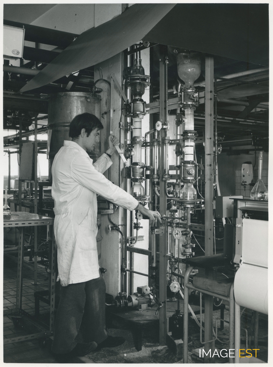 Laboratoire de l'École nationale supérieure des industries chimiques (ENSIC) à Nancy (Meurthe-et-Moselle). Cachet du photographe " Charles André Nancy n° 6- 5689 ". Une mention manuscrite au verso précise : " Michel Perrut (thèse (1972) - Étude du transfer de matière dans une colonne à pulvérisation liquide-liquide ".